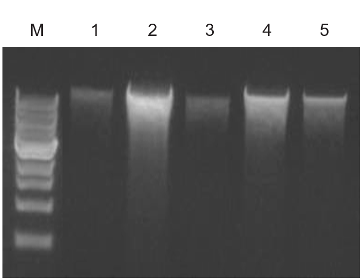 High-quality total DNA was isolated from different environmental sample sources using the Quick-DNA™ Fecal/Soil Microbe Kit and compared against other suppliers. (A) Equivalent amounts of feces were processed using each kit, then equal volumes of eluted DNA were analyzed on a 0.8% (w/v) agarose gel stained with EtBr. (B) Metagenomic DNA isolated from 5 soil samples. M: 1 kb marker (NEB); 1-5: soil samples (sand, sandy clay loam, hydrophobic sandy loam course, sandy loam, fine gravel).