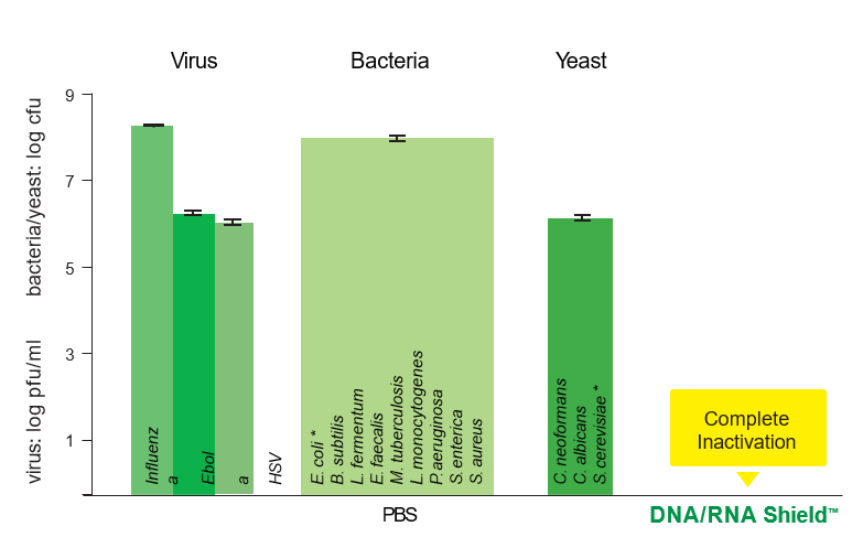 Viruses, bacteria and yeast are effectively inactivated by DNA/RNA Shield™. Samples containing the infectious agent (virus, bacteria, yeast) were treated for 5 minutes with DNA/RNA Shield™ or mock (PBS). Titer (PFU) was subsequently determined by plaque assay. Validated by: Influenza A – D. Poole and Prof. A. Mehle, Department of Medical Microbiology and Immunology, University of Wisconsin, Madison; Ebola (Kikwit) – L. Avena and Dr. A. Griffiths, Department of Virology and Immunology, Texas Biomedical Research Institute; HSV-1/2 – H. Oh, F. Diaz and Prof. D. Knipe, Virology Program, Harvard Medical School; E. coli, L. fermentum, B. subtilis, S. cerevisiae – Zymo Research).